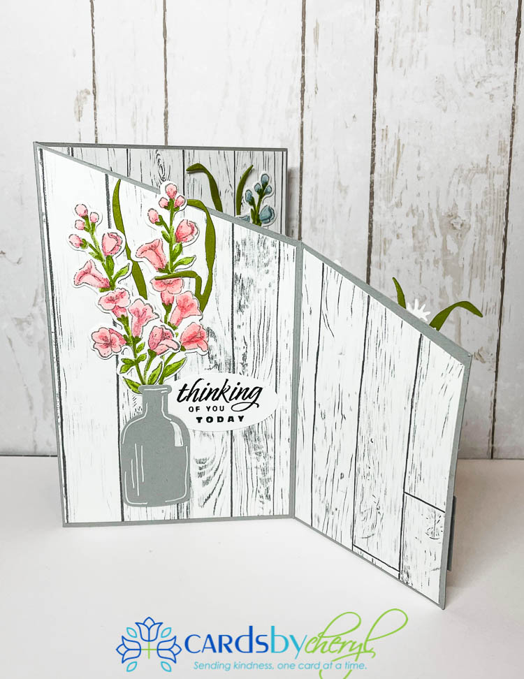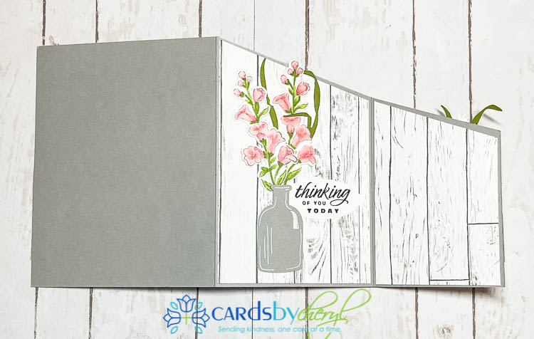 The vase I created for the flowers on this panel uses the vintage bottle punch. Then I went in with a white gel pen and created the highlight details on the bottle. The stamp set that goes with the punch has an image that can stamp out the highlights for you, but because I modified the bottle punch (made it shorter to fit on the card) I could not use the corresponding stamp. So instead I just drew in the highlights by hand. Easy peasy!
