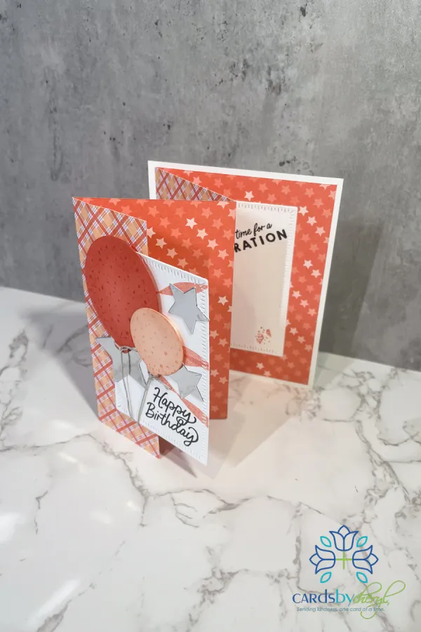 A birthday card with orange balloonsGuys, I had a ton of fun playing with this (new to me) fun fold design that I recently CASE’d from Kylie Bertucci. I saw this on her You Tube channel and knew I had to try it and have some fun using up some of stacks of extra designer paper that I have on hand.