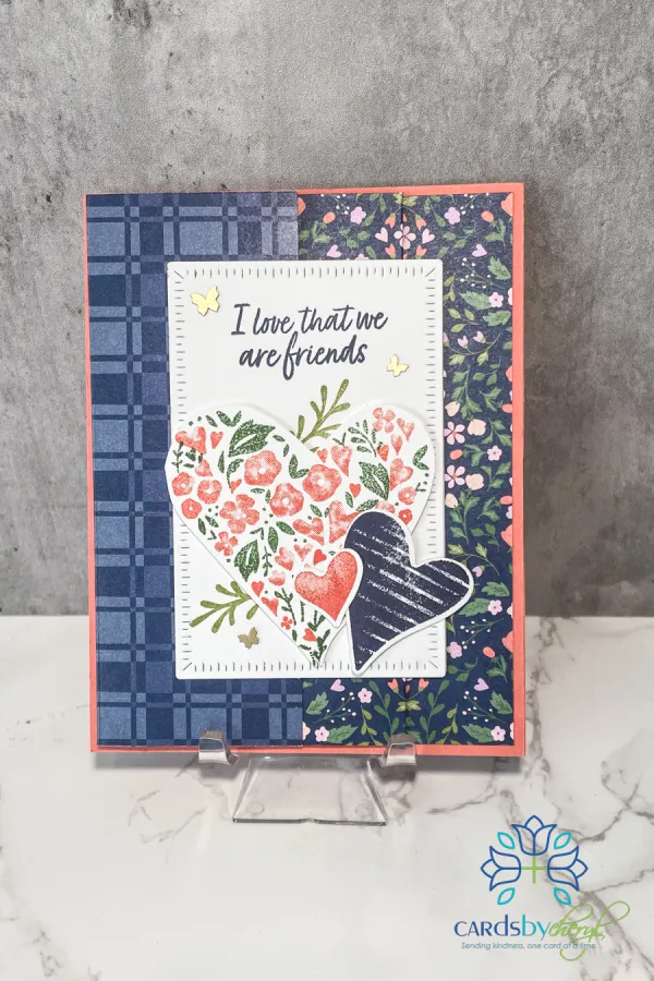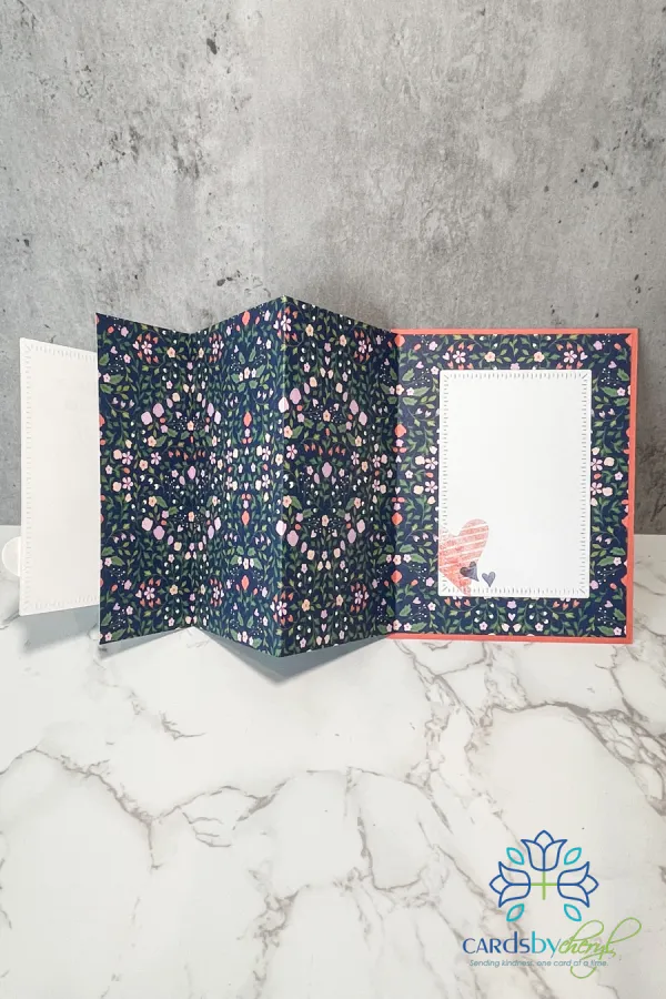 This fold is so easy and you’re going to have so much fun using up that 12 x 12″ DSP that we all love to hoard. I am on a bit of a mission to use some of the DSP that I already have (need to make some room, ya know?). This card uses just under a half sheet of 12 x 12 DSP and I love that we can let all the beautiful papers do the work for us with minimal stamping. So you can get two cards from one sheet with a little strip of extra that you can use for decorating the envelope.