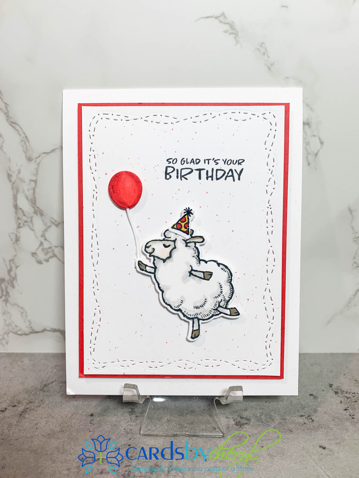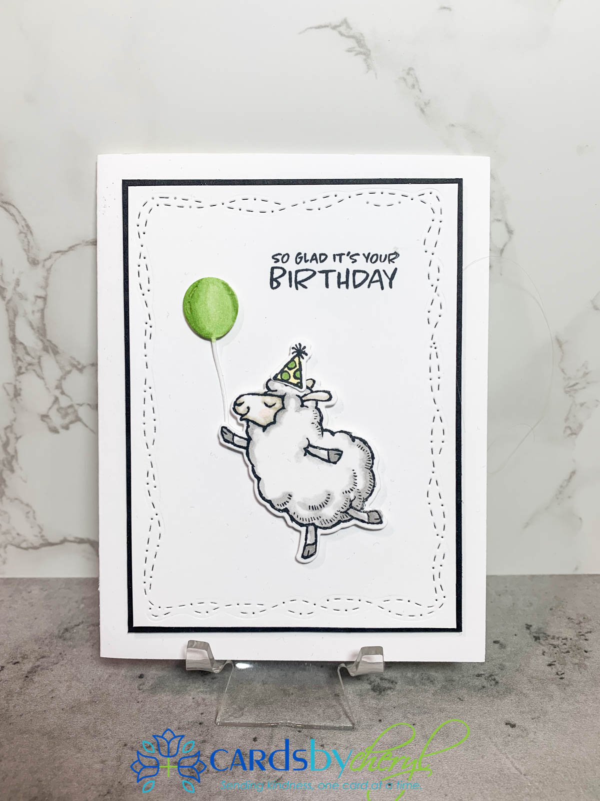 - Adhere the party hat to the sheep with liquid glue, then adhere the sheep to the front of the card panel with dimensional adhesive.