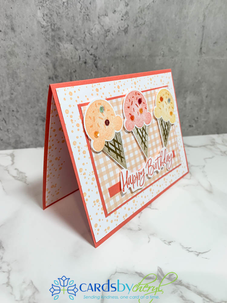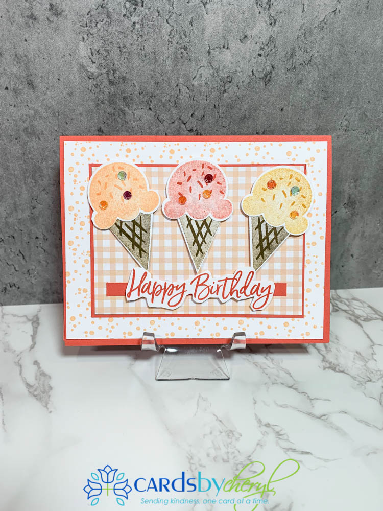 This card was created using the Sweet Ice Cream stamp set and the coordinating punch called the Ice Cream Cone Builder punch. This punch makes it so easy to create these adorable treats for your card.