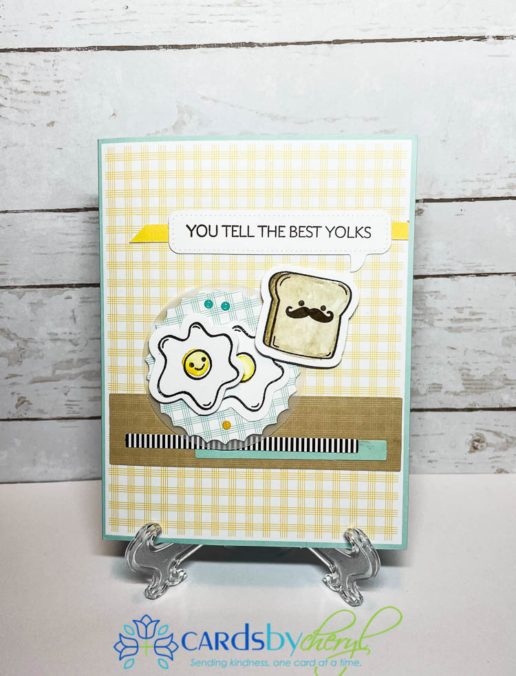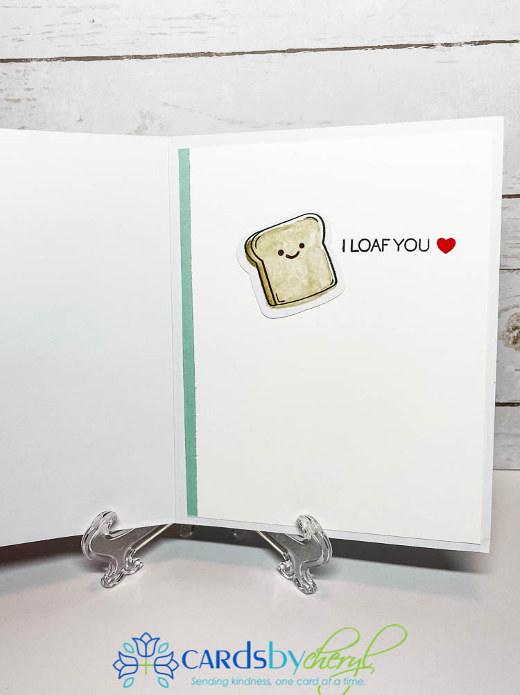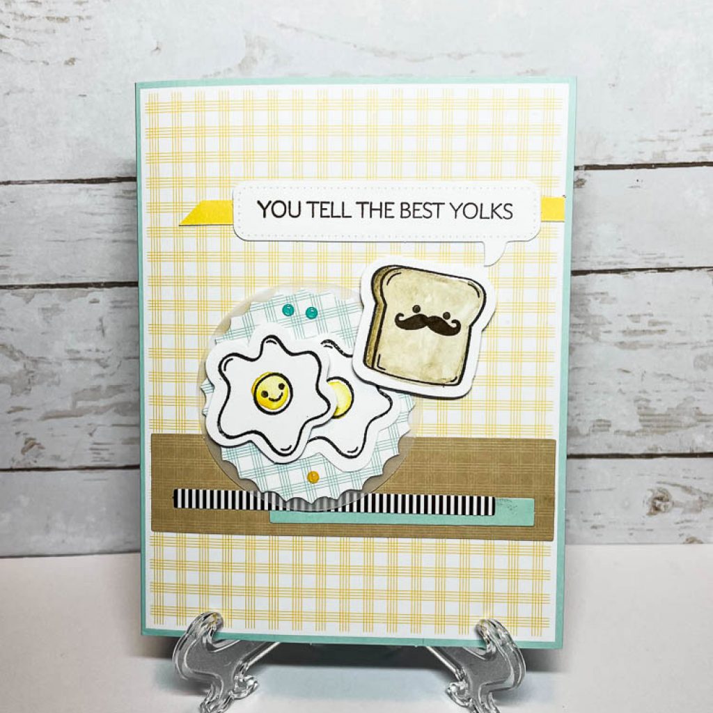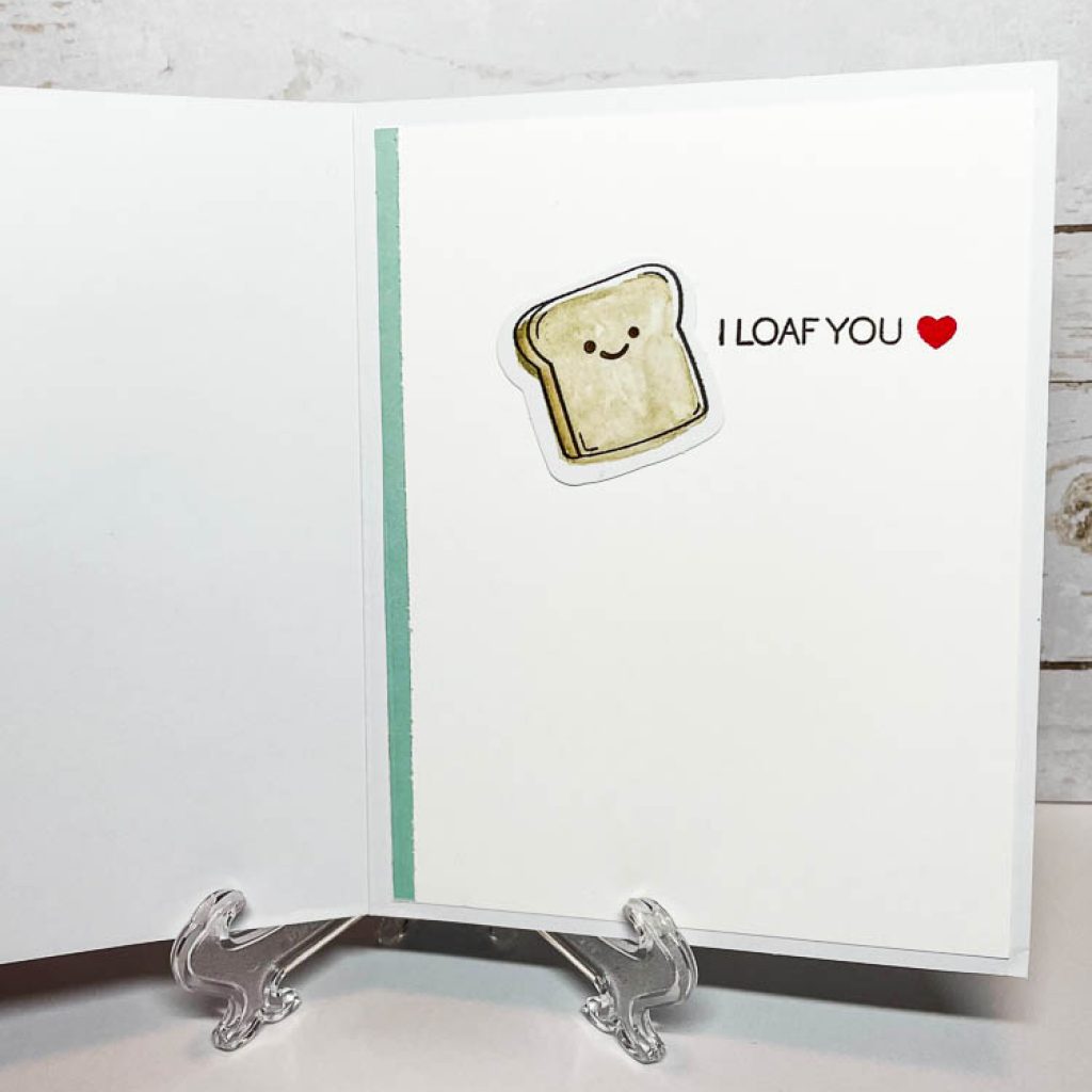 This next card is probably my favorite. The little toast guy with the mustache is so stinking cute… I used all the various elements available from the kit – so no added supplies needed. (Whoops…I take that back, I did stamp the red heart inside with poppy parade ink.) I popped up one of the eggs and the toast with a dimensional and the rest of the layers are adhered flat so it’s not so bulky to send. For the inside I added another one of the die cut toasts (but you could also stamp this and color it if you run out of the toast die-cuts and it would be just as cute). This one is going to my dad…because he does tell the corniest jokes and I really “loaf him”. :)