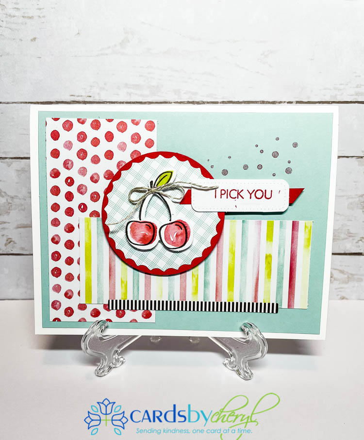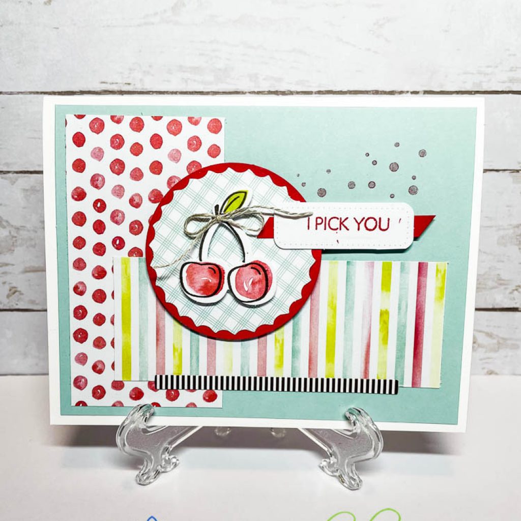 This last card sample I made came together so quickly! I love the splatter stamp that comes with this set and so I inked it up with some poppy parade ink and stamped just a couple times around the green splatter on the card base. I stamped the “hi” and the “you are cherry sweet” in early espresso and cut them down with my trimmer. The rainbow strip and the scalloped red strip came with the kit, so nothing extra needed. Pop up the sentiments and the cherries with some dimensionals and add a bow – voila, you’re done!