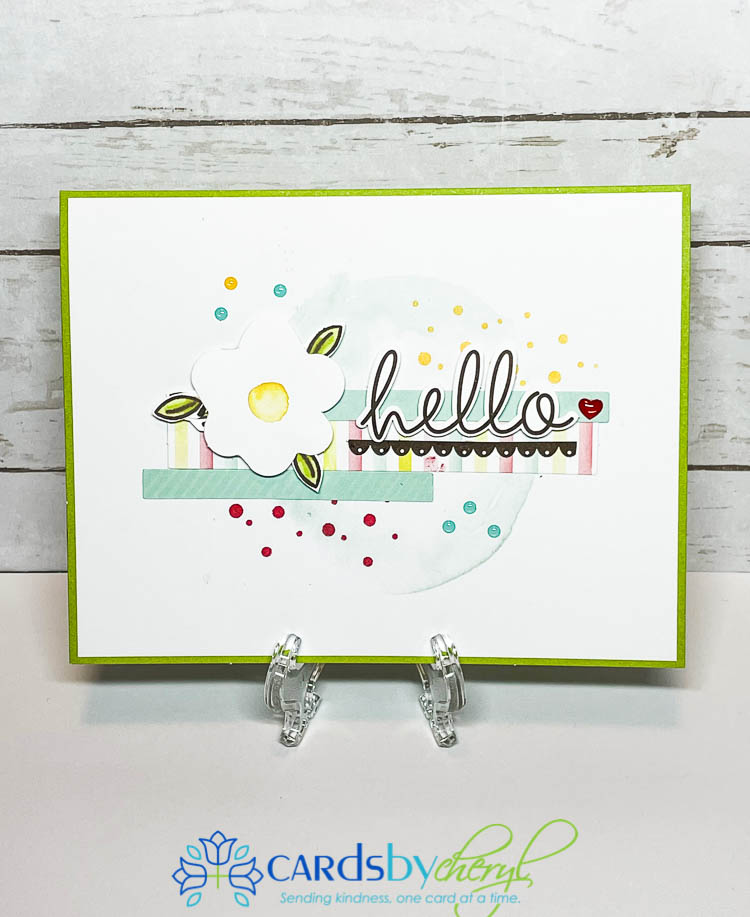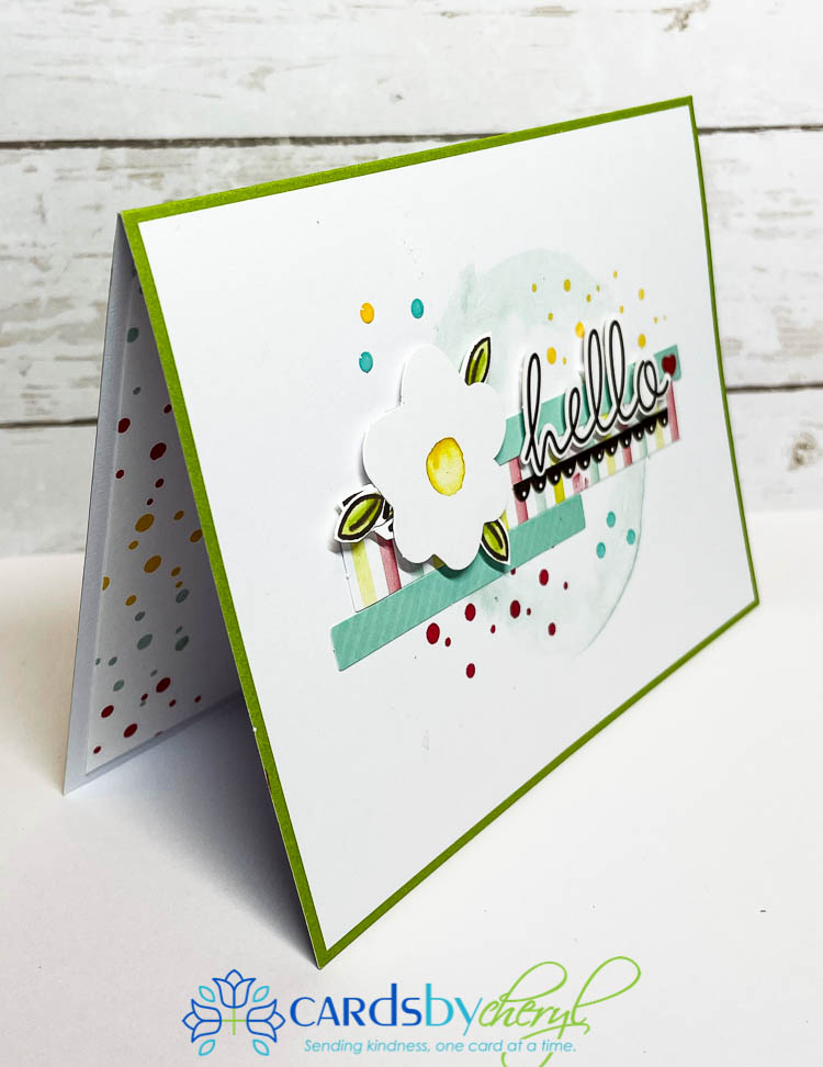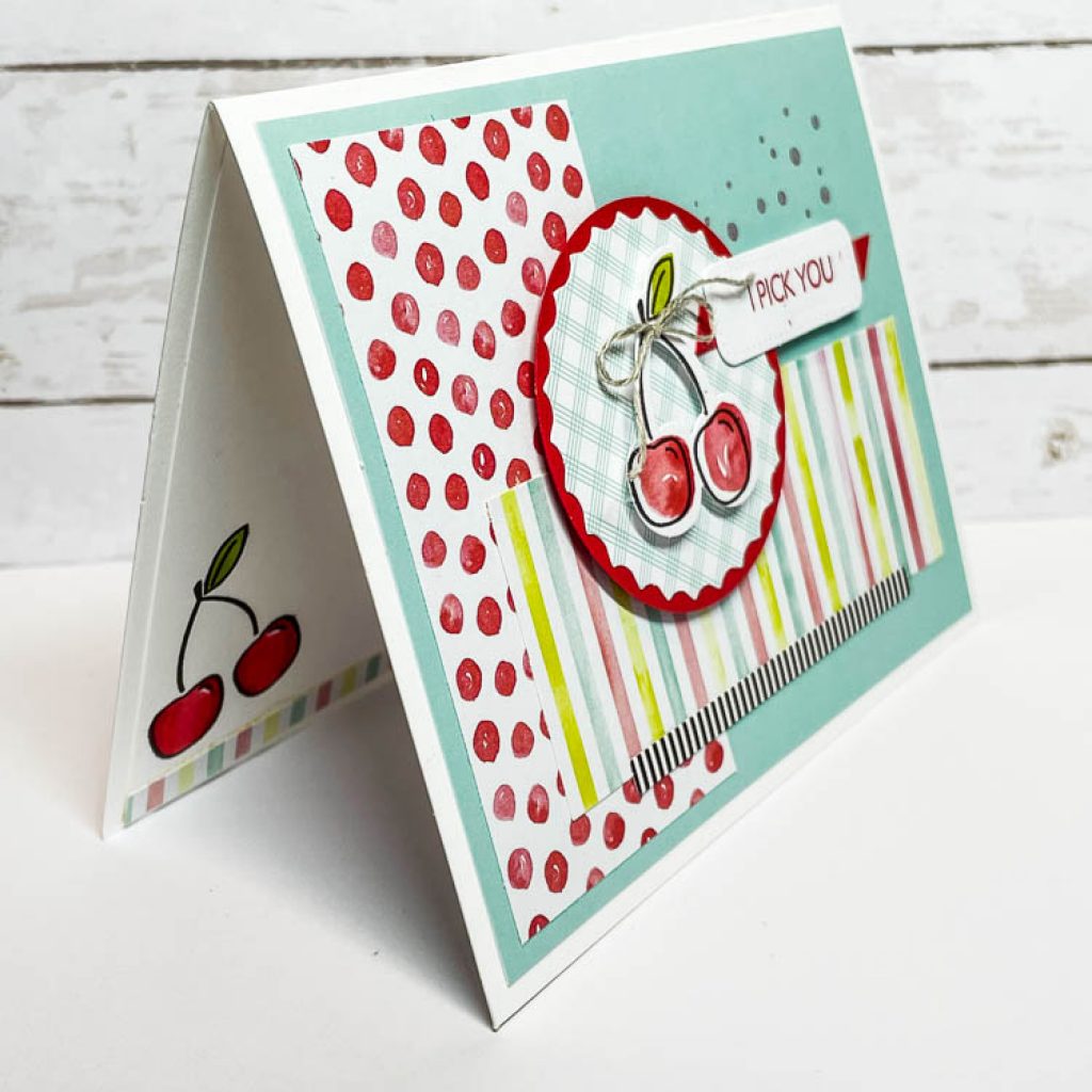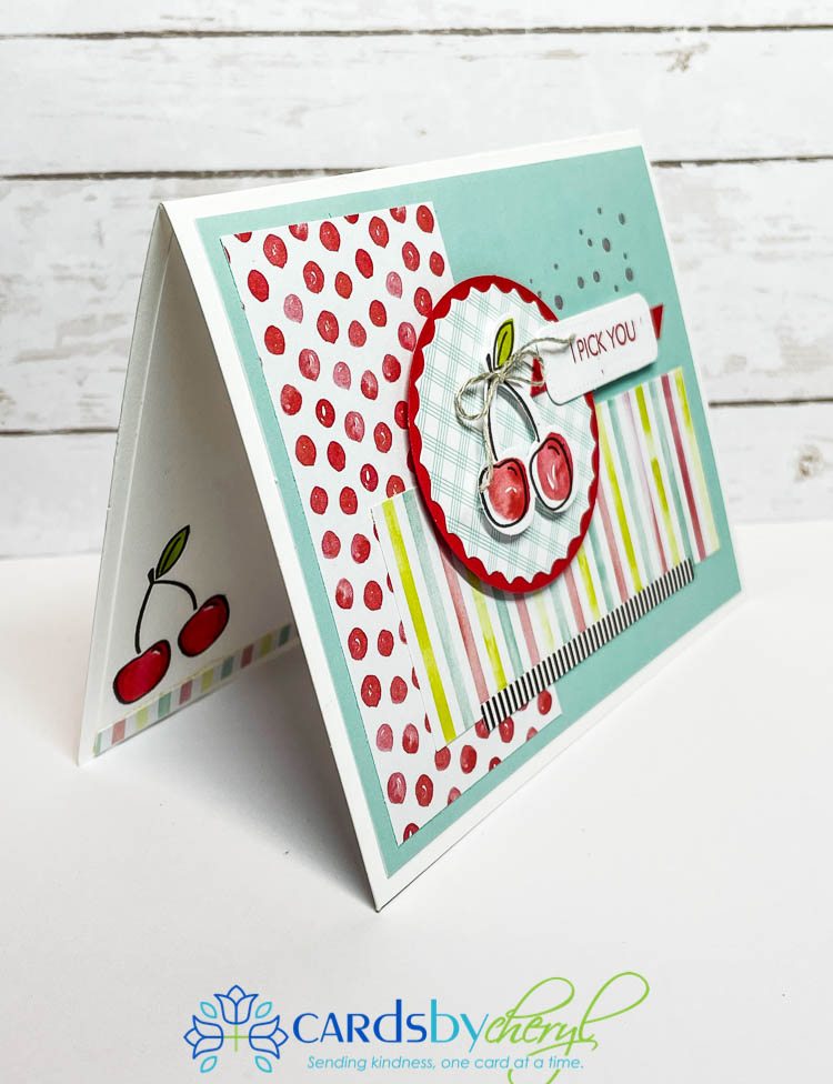 For this hello card below – did you notice I converted the fried egg into a flower? How fun is that! To create the leaves, I stamped the cherries four times, colored just the leaves and fussy cut them out. I adhered them to the back of the fried egg to make it look like a flower…so cute!