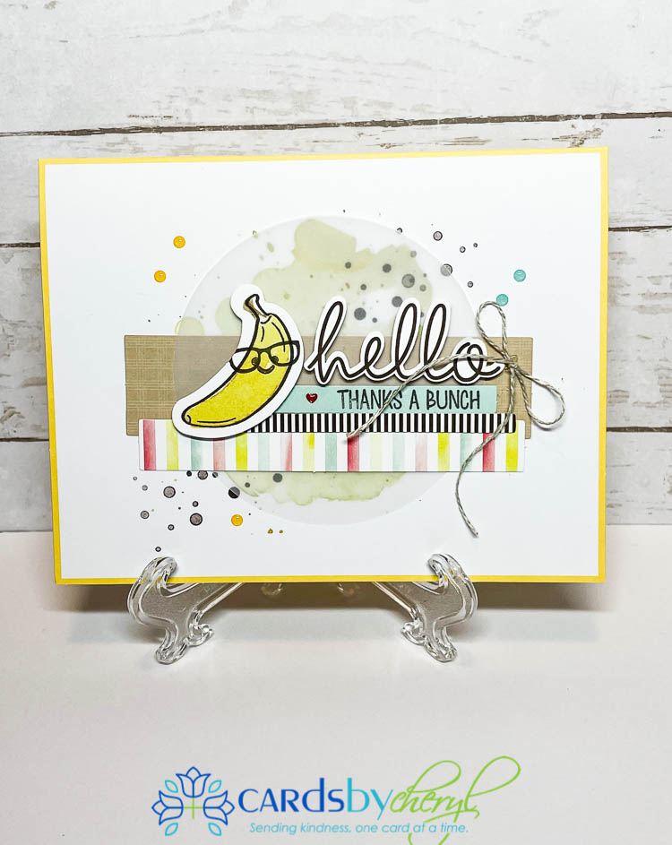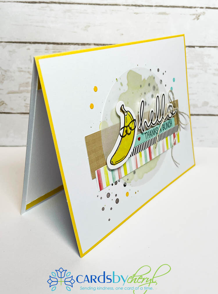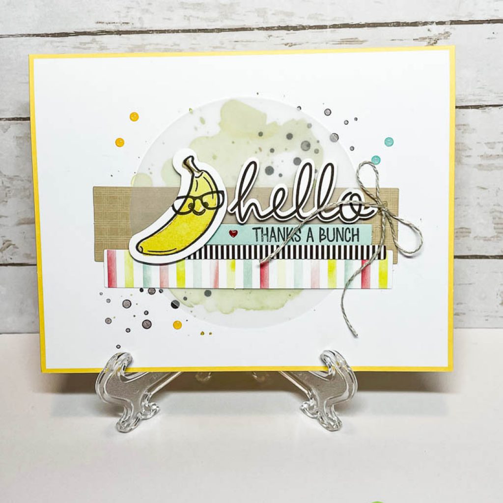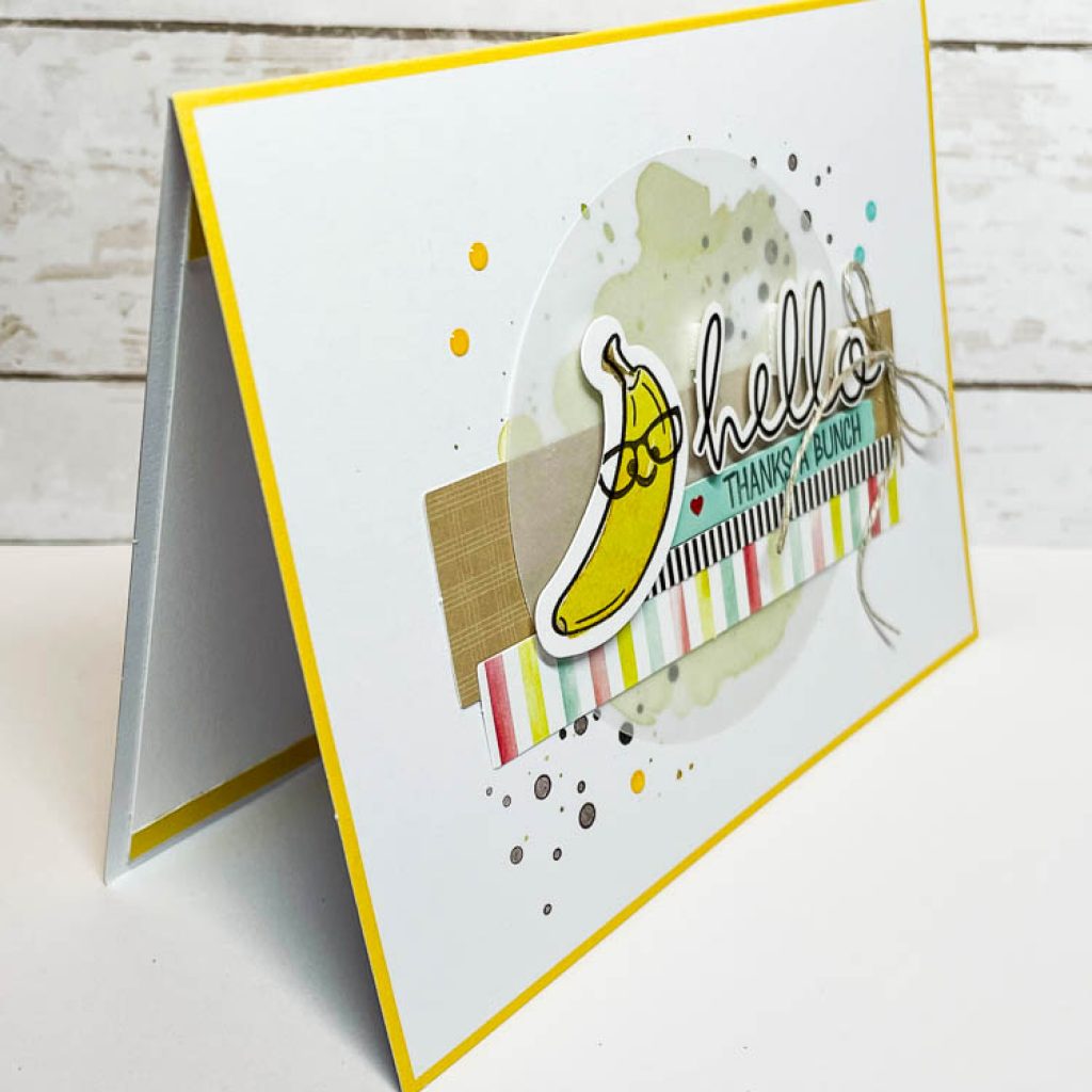 The next card design was taken right from the instruction sheet that comes with this kit. The only thing I changed up was that I used the “thanks a bunch” sentiment instead of “peel better soon”. Lots of layers and lots of color with this card – it’s super fun. This inside was left blank – but I did add a small yellow strip of trim to the bottom to tie it all together. Isn’t this such a happy looking card?