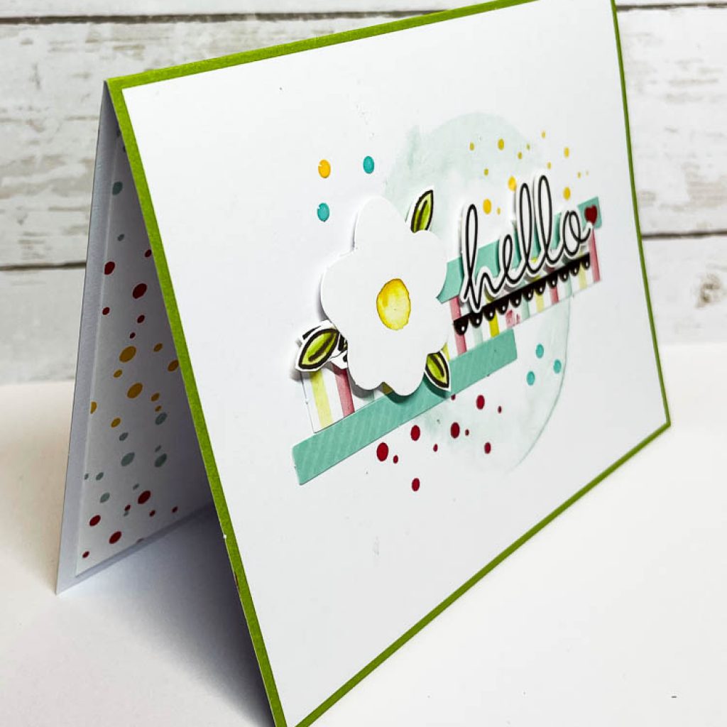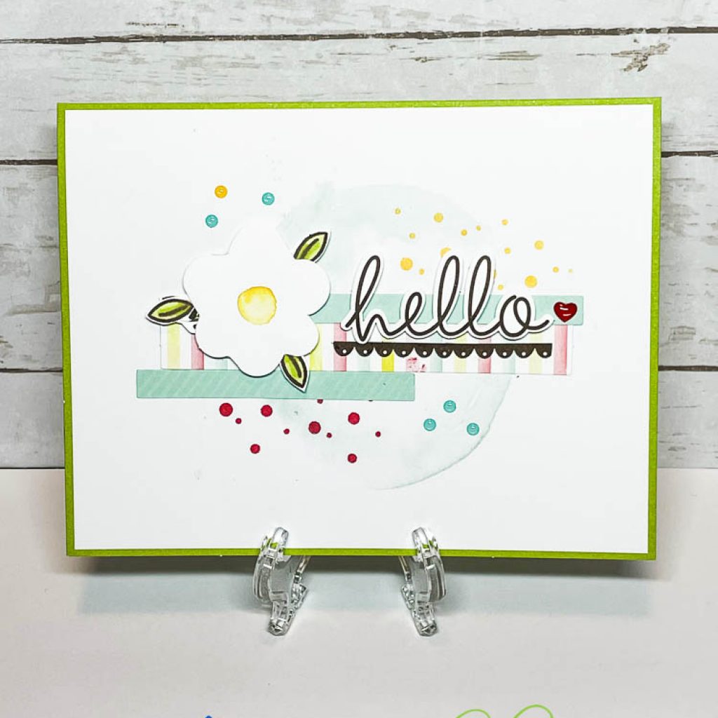 I wanted to mention one more thing about this card – because this is such a sweet everyday occasion card, I decided that I would want to make a bunch of these to keep on hand. But…there are only 3 of the hello die-cuts in the kit. So, if you don’t want to order a refill kit, then just go to your Biggest Wish stamp set and stamp out the scripty hello and fussy cut it. This is a perfect sized replacement to the die-cut “hello” that comes in the kit.