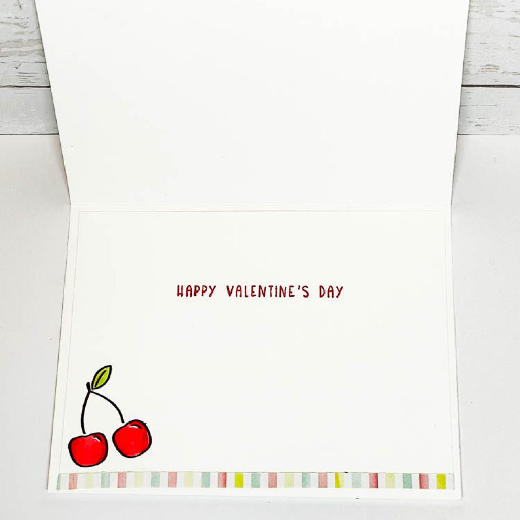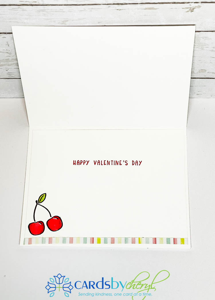 I thought this would make an adorable valentine’s day card, so for the inside, I used the Sweet Conversations stamp set – which is a brand new set available in the Jan – June Mini catalog that just released. I stamped and colored the cherries for a little pop of color to the inside and added a little rainbow strip that was a remnant from the envelope I cut open. Cute, huh?