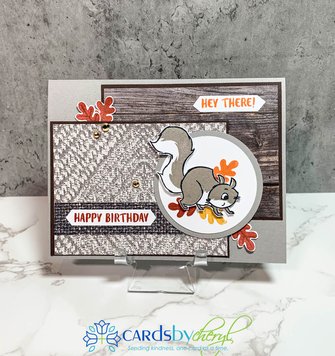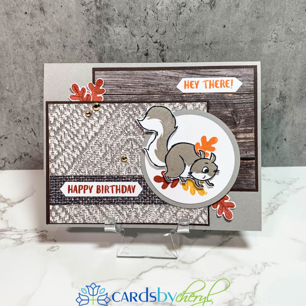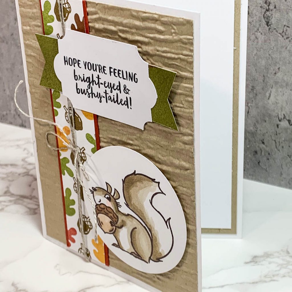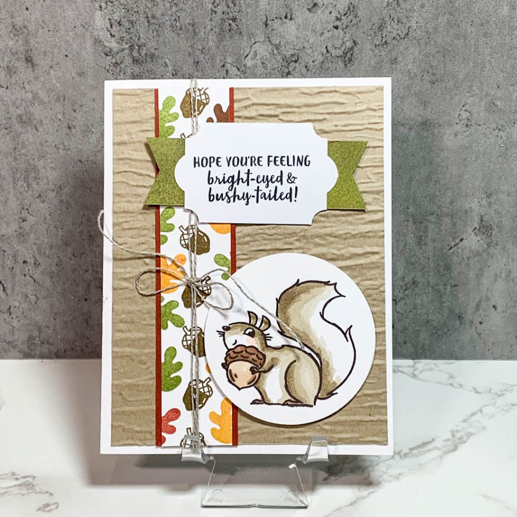 This set does not come with dies, but the squirrels and leaves are actually pretty fast to fussy cut. And, if you’re not into fussy cutting, just stamp it and punch it out with a circle punch like I did here below. This card uses the Bark embossing folder for the background (crumb cake card stock) and the little up and down banner I hand stamped using the leaves from the set, plus I grabbed the little acorn stamp from the Banner Year stamp set. I lined that border strip with cajun craze. The punch for the sentiment is the Every Day Label punch. The green flagged banner behind the sentiment is from the DSP paper set called Beauty of the Earth.