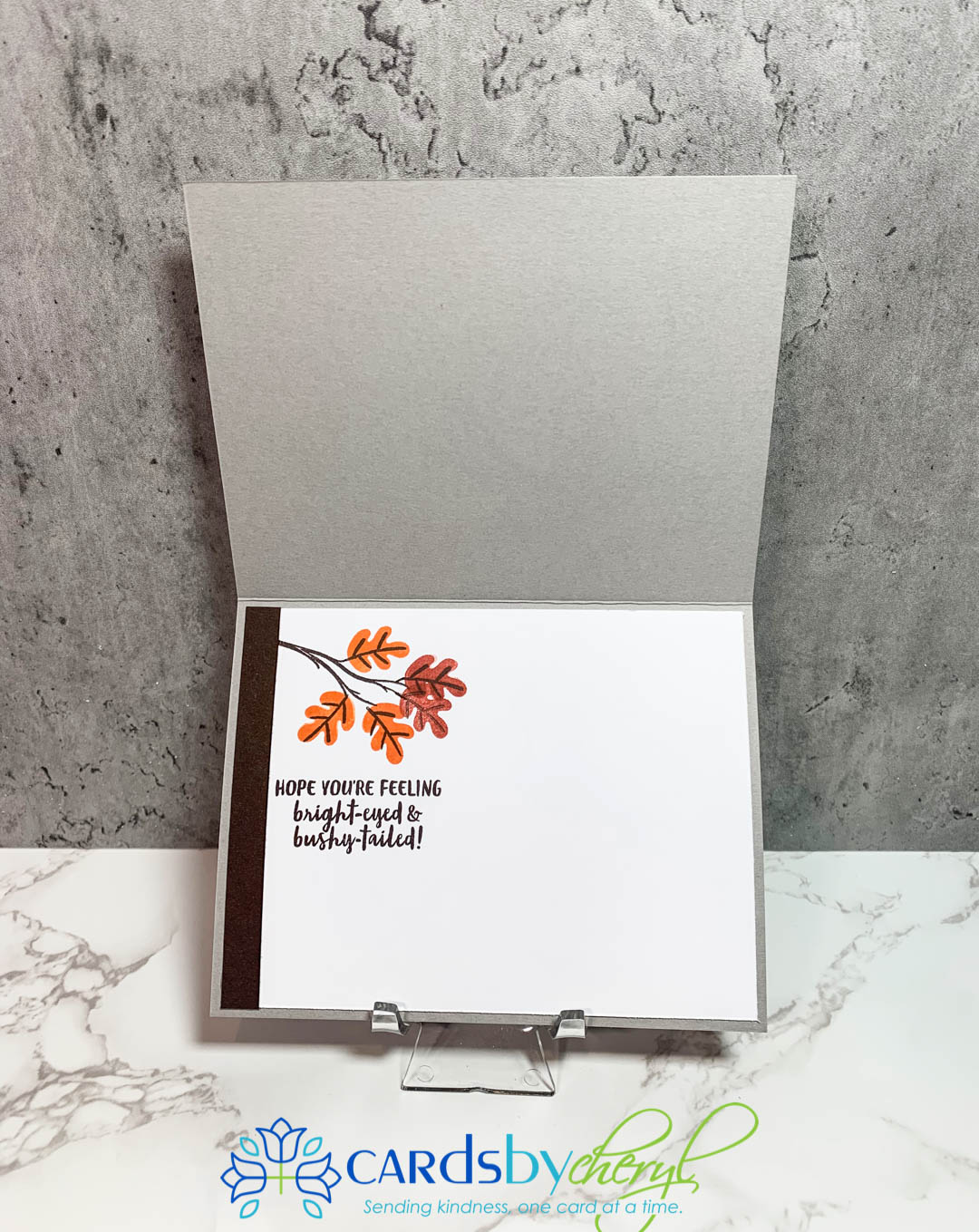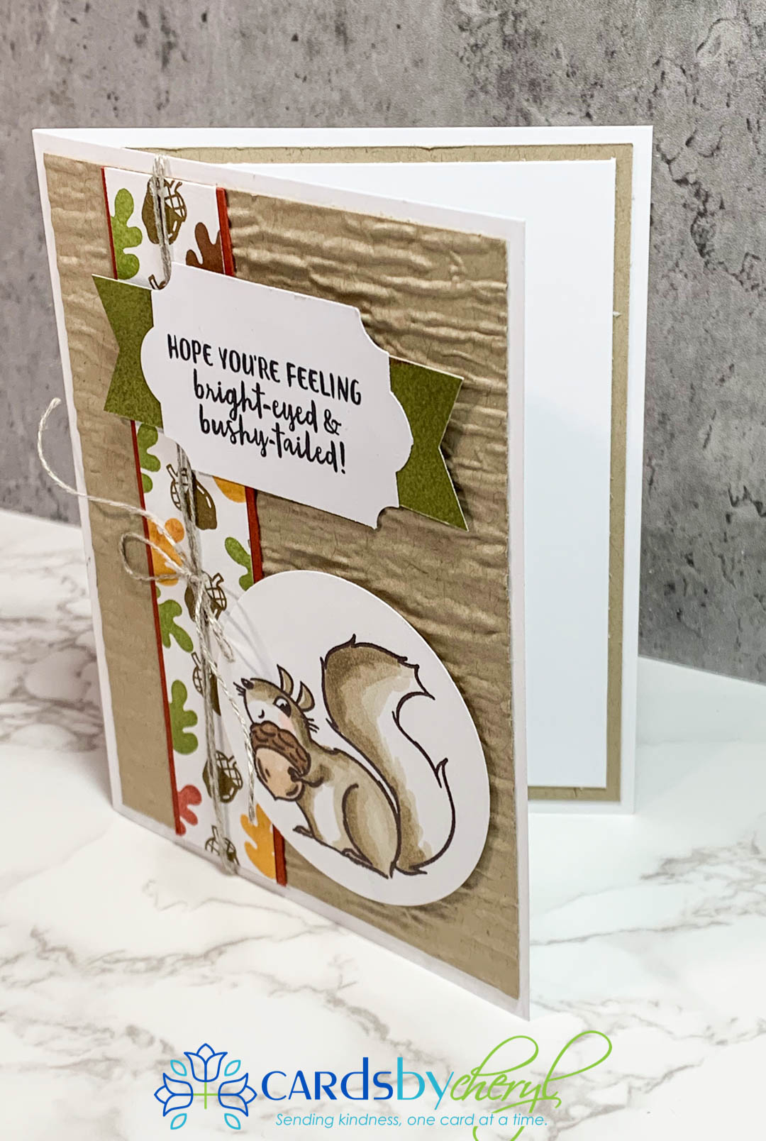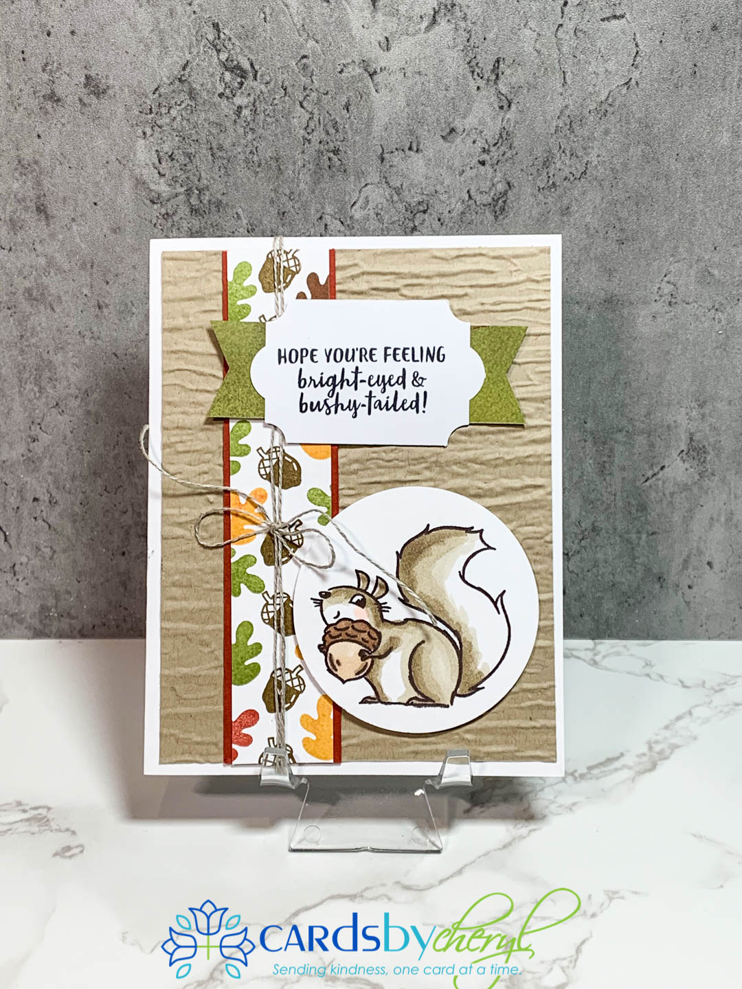 This set does not come with dies, but the squirrels and leaves are actually pretty fast to fussy cut. And, if you’re not into fussy cutting, just stamp it and punch it out with a circle punch like I did here below. This card uses the Bark embossing folder for the background (crumb cake card stock) and the little up and down banner I hand stamped using the leaves from the set, plus I grabbed the little acorn stamp from the Banner Year stamp set. I lined that border strip with cajun craze. The punch for the sentiment is the Every Day Label punch. The green flagged banner behind the sentiment is from the DSP paper set called Beauty of the Earth.