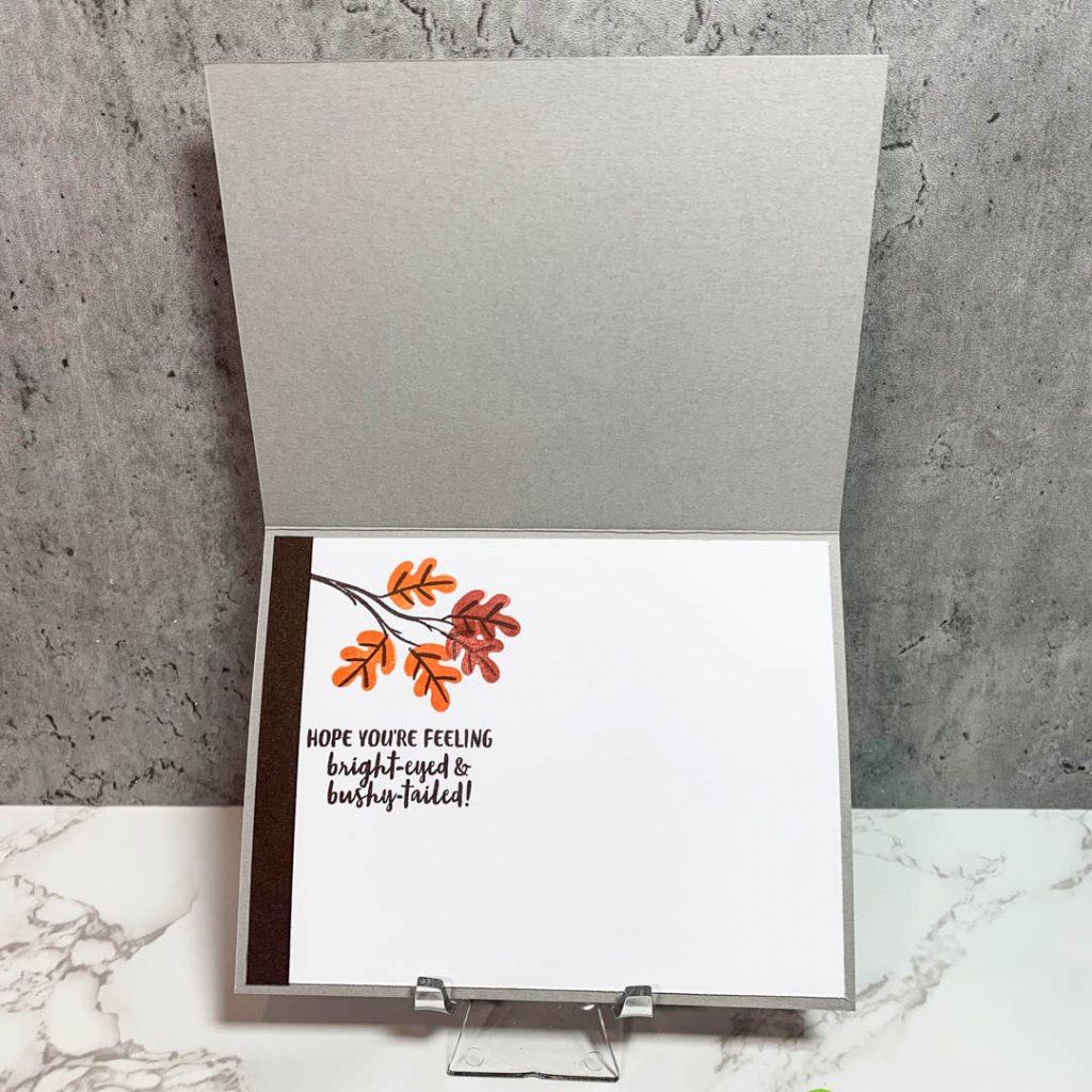 For this next card, I wanted to showcase the In Good Taste DSP – which is still going strong in the annual catalog – so this paper will be around for a bit. It really is a versatile paper set and great for Masculine cards! The card base is gray granite and I also stamped the little squirrel with gray granite to match. the leaves are stamped in cajun craze, bumblebee and pumpkin pie. The accent card stock behind the DSP is early espresso.