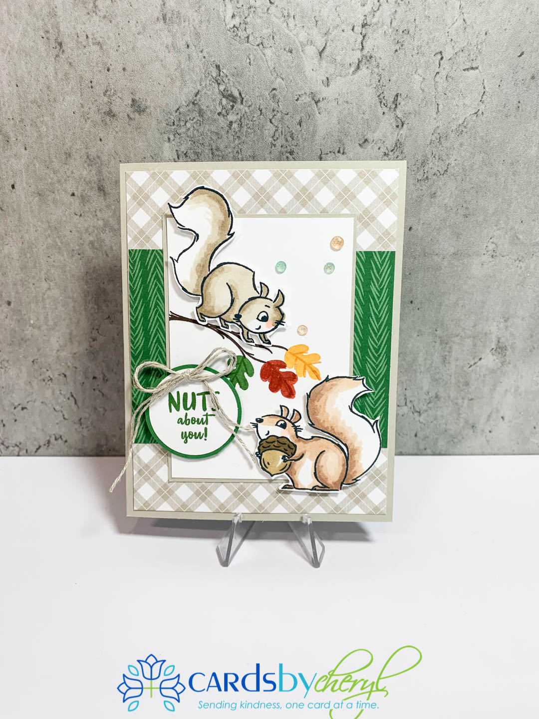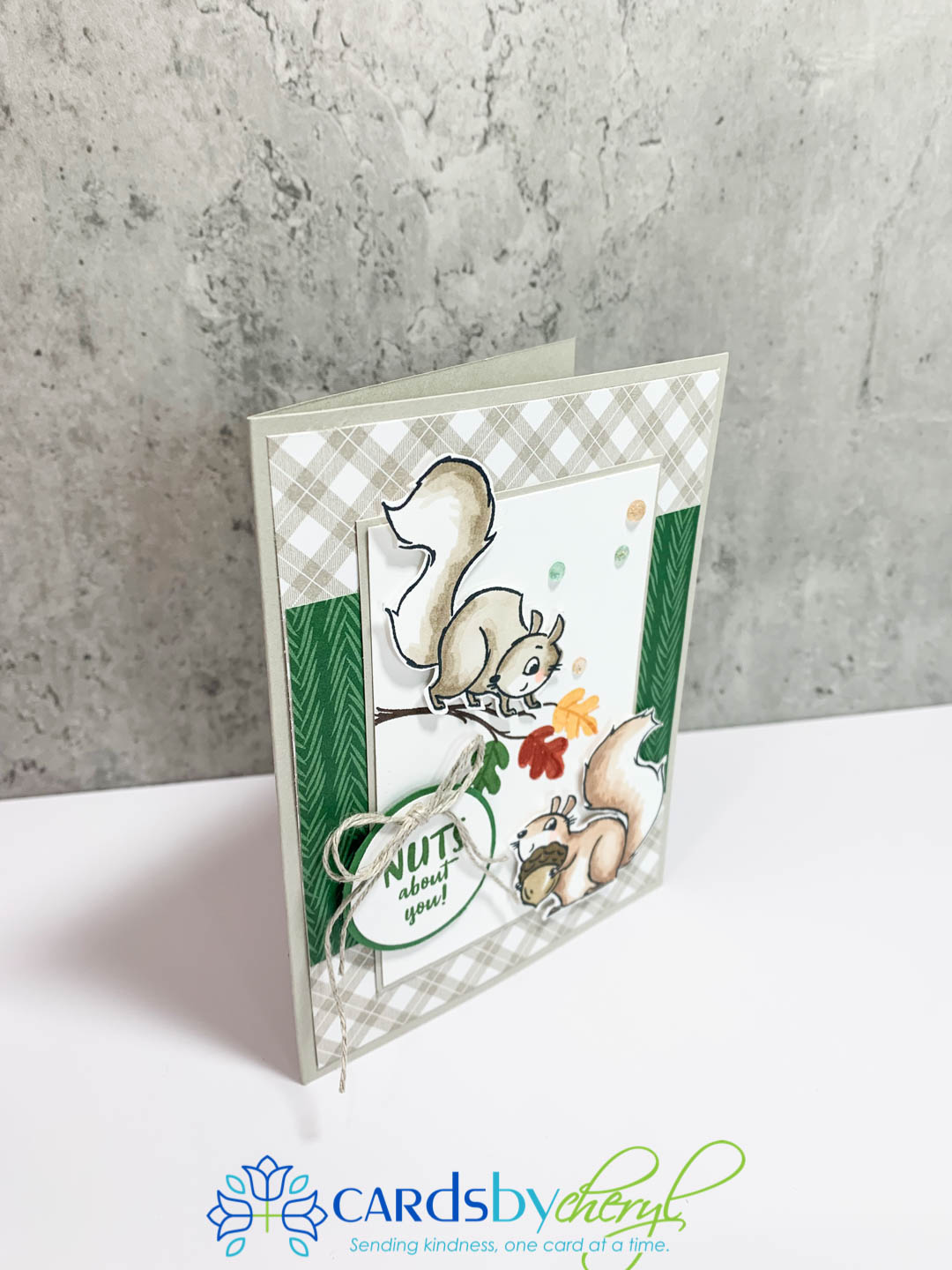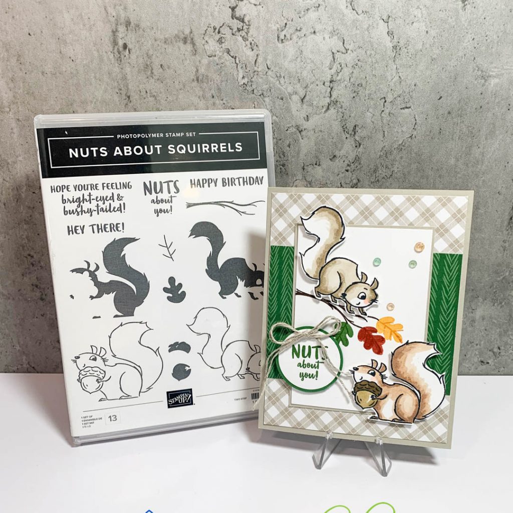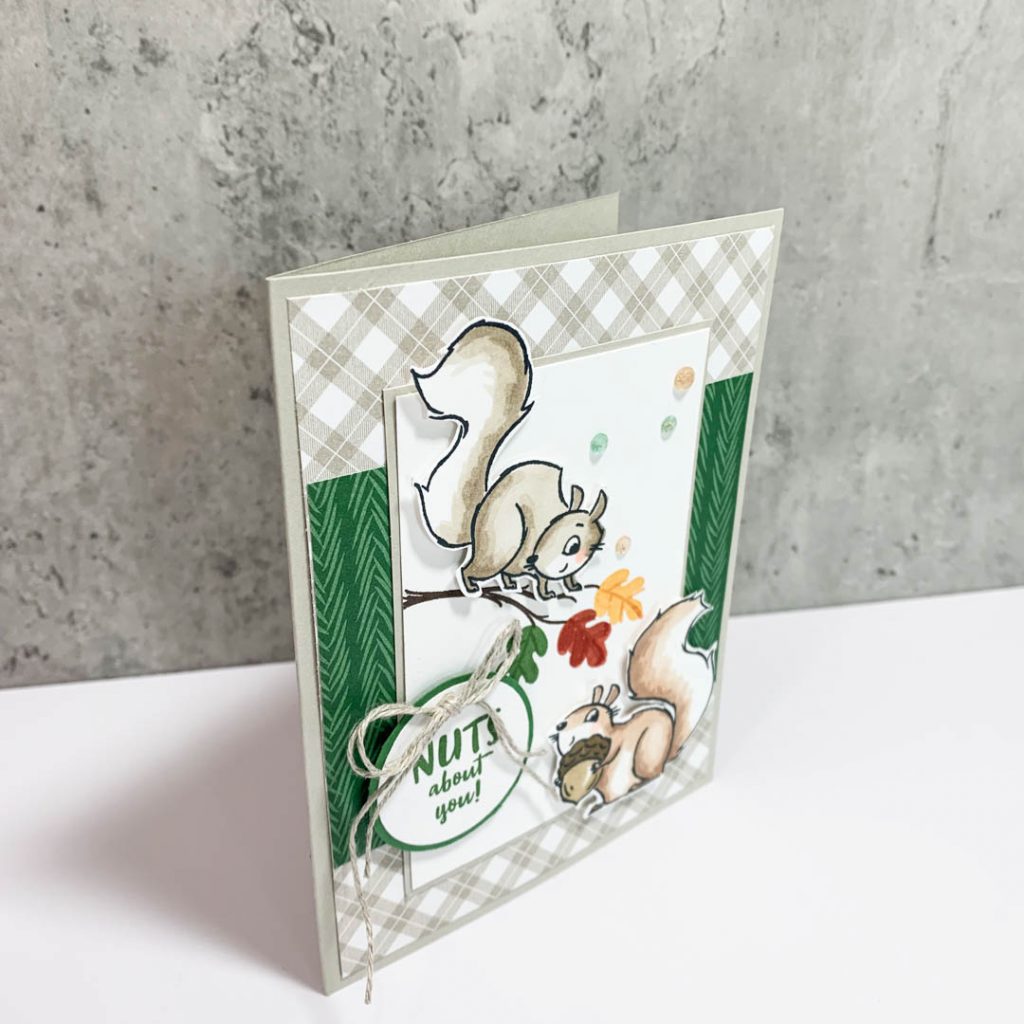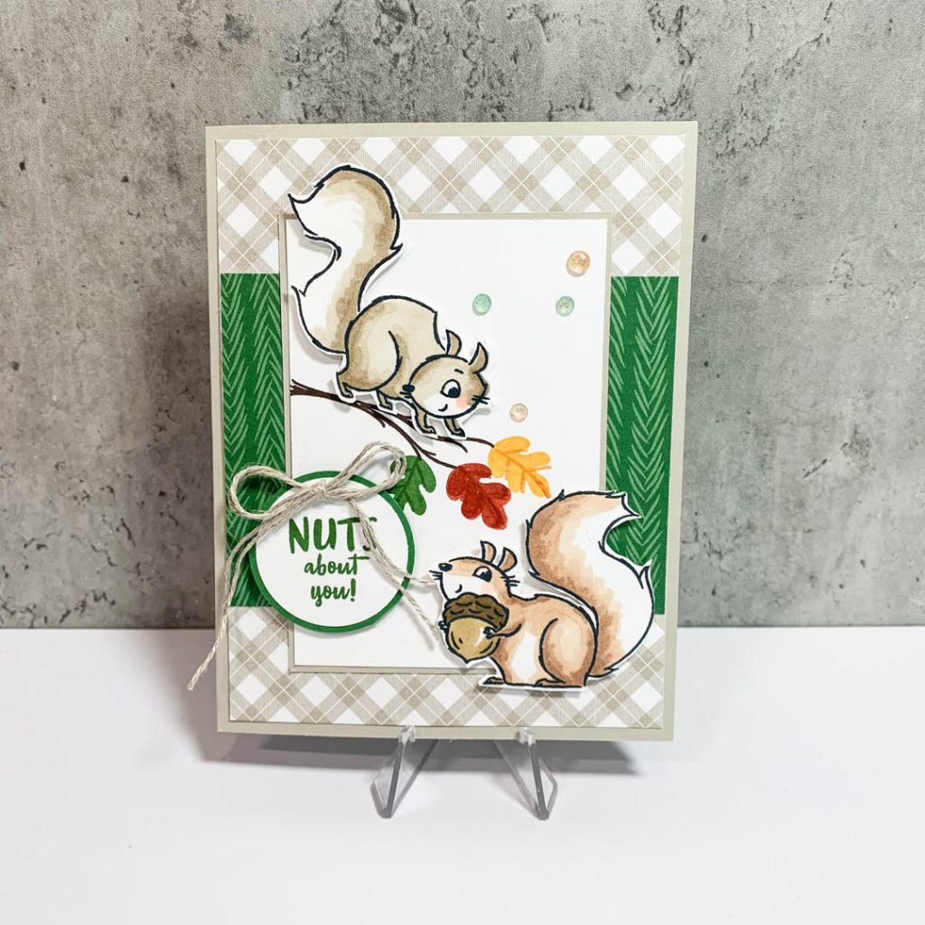 Ok, last card to share with you is my favorite! This one uses the new paper from Sale-A-Bration called Peaceful Prints. The Peaceful Prints is really a holiday DSP, but the this is also very versatile for fall cards. I am loving all the plaids that Stampin’ Up is showcasing this year with their papers. Colors used are Sarah Sand, Garden Green. I hand colored the squirrels with my alcohol blends using Crumb Cake (Light & Dark) and the other squirrel was colored with the Ivory and Bronze Stampin’ Blends.