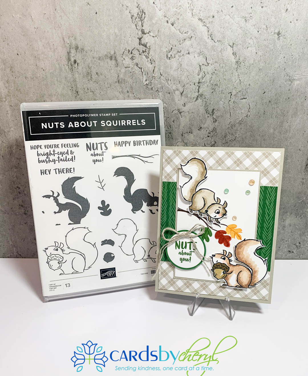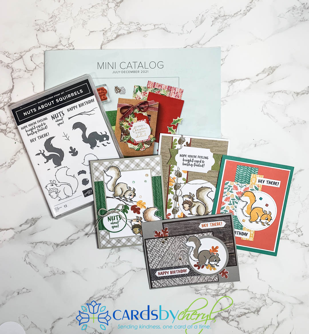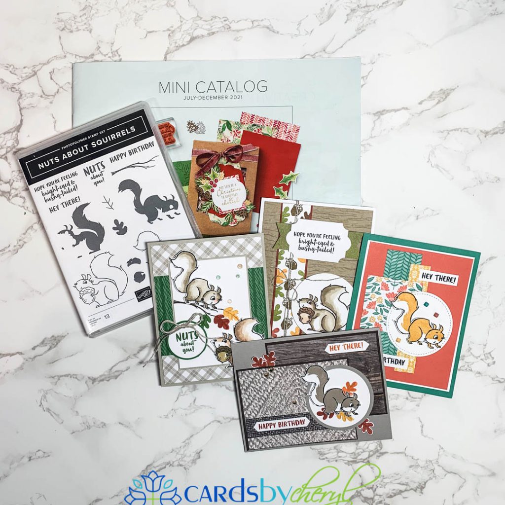Hello friends. The Nuts about Squirrels stamp set is what I used for today’s card. This set is available now in the new mini catalog that just launched on Aug 3rd. I had so much fun creating these cards! Also, it’s Sale-A-Bration time right now so for every $50 you spend you get to choose a free product from this catalog. So, it’s a perfect time to stock up on your holiday items and enjoy free products!