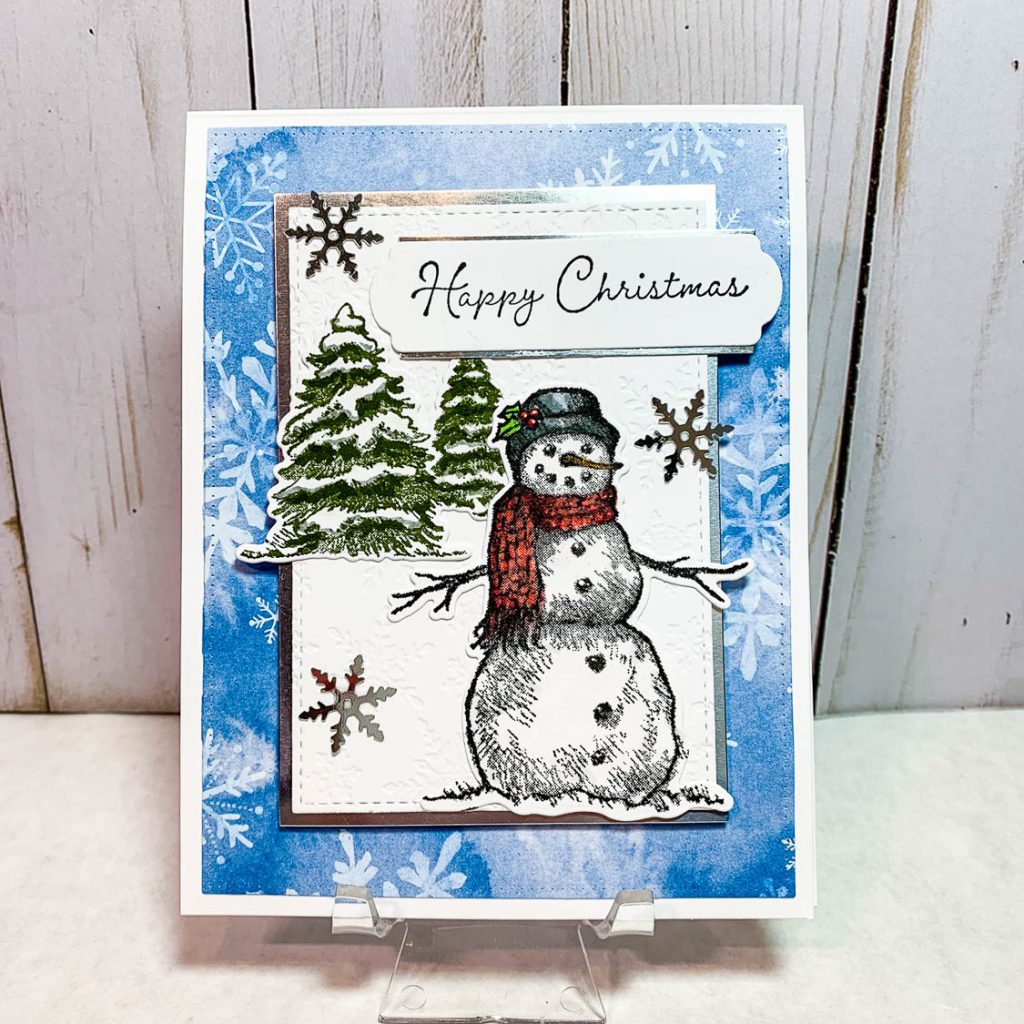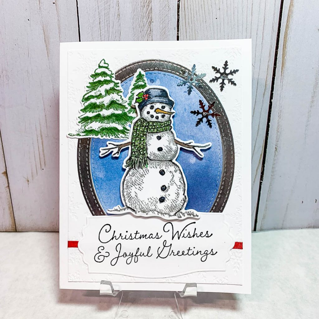 This snowman stamp is really very detailed and does not require much coloring – so it’s super fast to put together one of these cards. For card #1 used my stacking stitched oval dies and cut out a border from the silver foil and once again with the snowflake splendor paper. I embellished with some red ribbon from my stash and a couple of sparkly silver snowflakes.