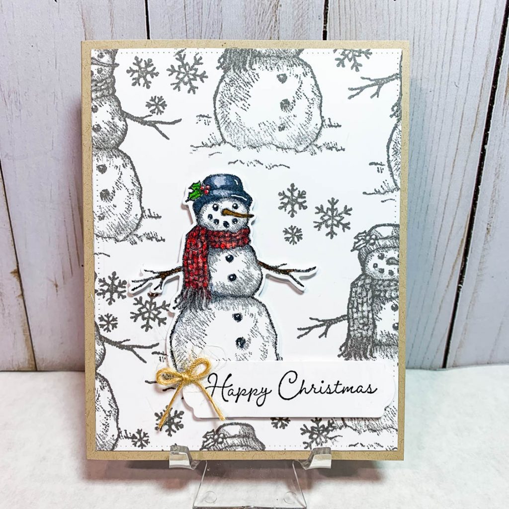 For the third card, I used the snowman stamp and morning mist ink to create a repeating pattern on the card base. I was going for the spotlight technique here which is why I chose to use gray ink instead of black. Then I stamped another snowman separately using black memento ink and colored him up and cut him out. I popped him up with some dimensional tape and added a tiny twine ribbon for an embellishment that I thought would tie it in nicely with the crumb cake card base.
