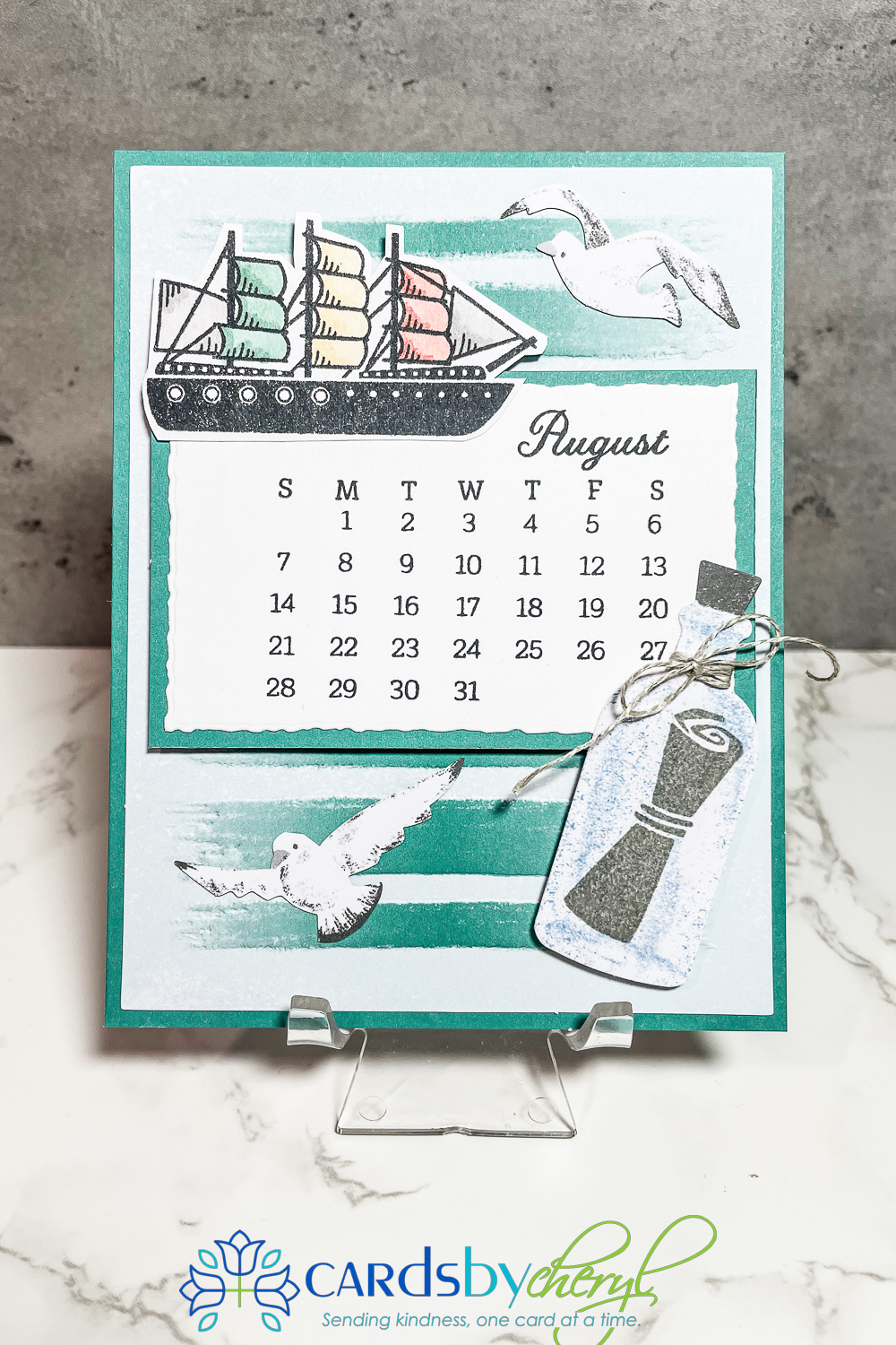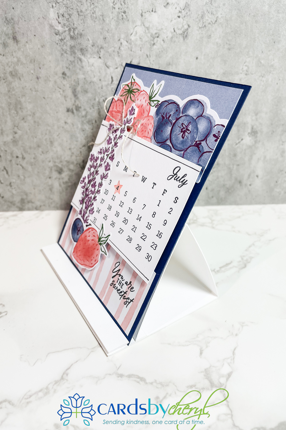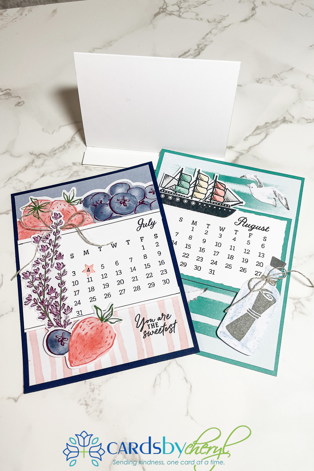 Here are two examples of my calendar page designs using the current (July kit) and last months’ kit for June. So cute! These are A2 size, so you can pop them in an envelope and mail one each month to a friend. There is even space on the back to write a note!
