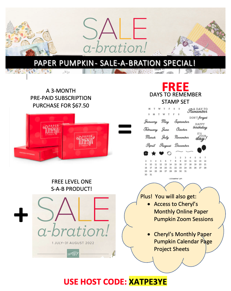 When you buy a 3-month pre-paid subscription to Paper Pumpkin, you get to pick a free sale-a-bration item and I will also send you a FREE Days to Remember stamp set so that you can craft along with me each month with a new calendar design.